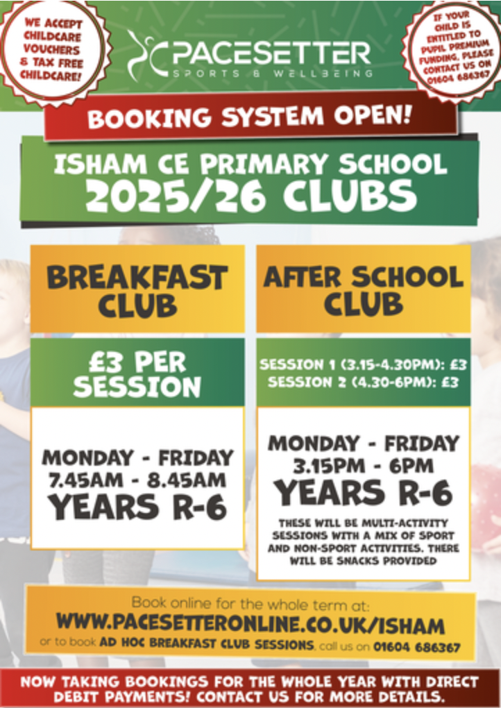 All bookings can be made via their website: www.pacesetteronline.co.uk/isham or by phoning 01604 686367.